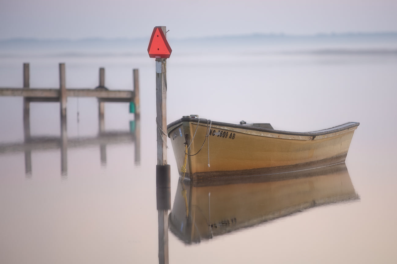 North Carolina, Knotts Island, Boat, Skiff, Reflection, Bay, Water, Fog, Sunrise