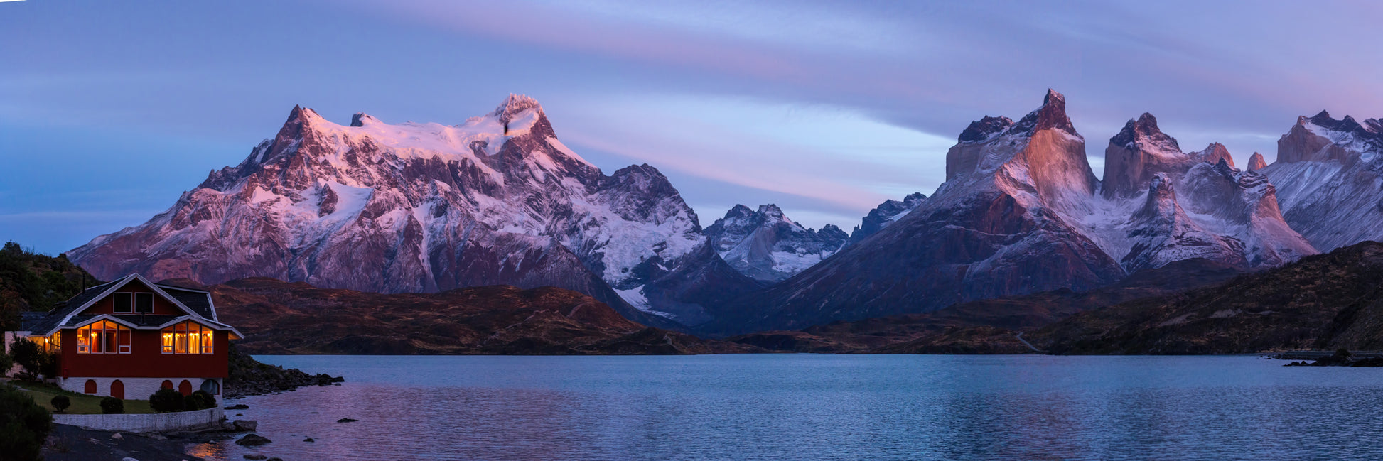 South America, Chile, Patagonia, Torres del Paine National Park, Lago Pehoé, Hostería Pehoé, Towers del Paine, Snowy Mountains, Clouds, Sunrise, Fall